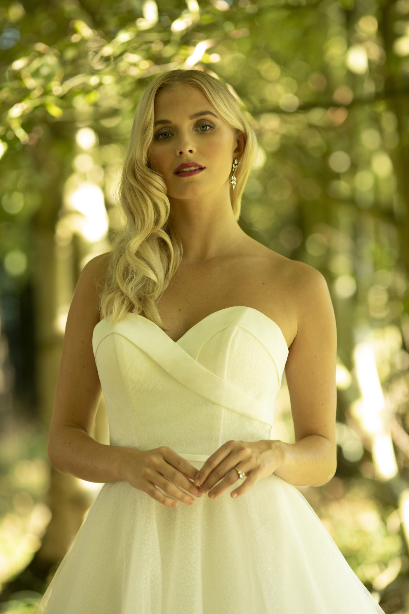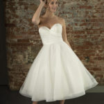 Style Mara Inspired by Dior’s 1940s vintage style, Mara is an elegant tea-length dress made in a stunning satin and a flocked spotty soft tulle. This glamorous strapless gown features a wide satin wrap over cuff neckline whilst the rest of the bodice is made from the spotted tulle. The waist has a narrow belt to accentuate the waist which leads to the fullest of circular skirts, that’s perfect for swishing in all day. It has a zip-up back and is finished with satin buttons.