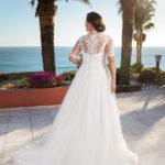 Style 21303 from the Tres Chic collection is the most beautiful ivory lace over ivory tulle skirt. This 3/4 length sleeve on a-line gown has a lovely illusion neckline and back.