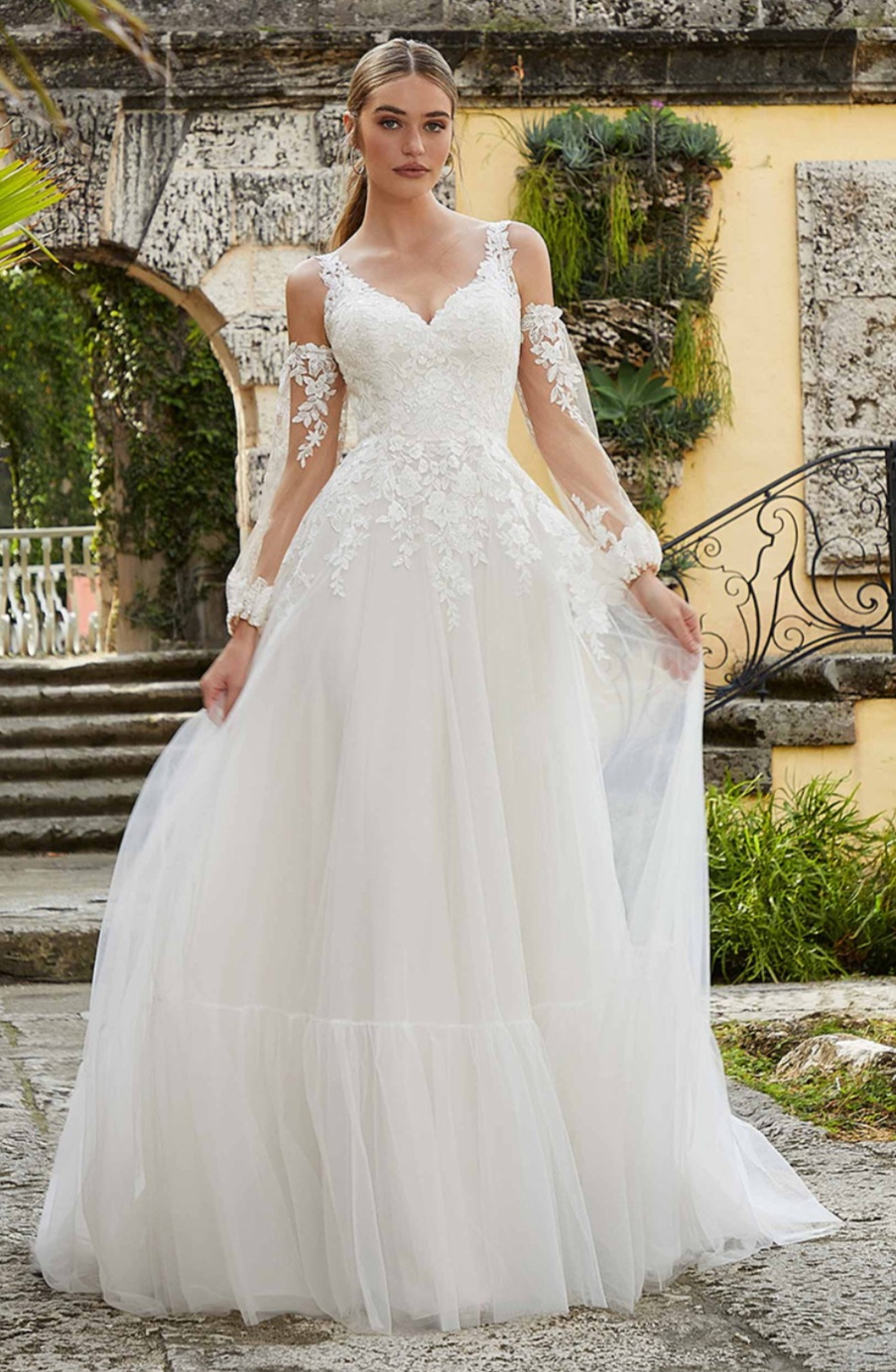Style 6978 from the Mori Lee Collection is a boho brides dream, billowing a-line frosted embroidered lace with airy net skirt and frilly flounced detail, open back and detachable bishop sleeve