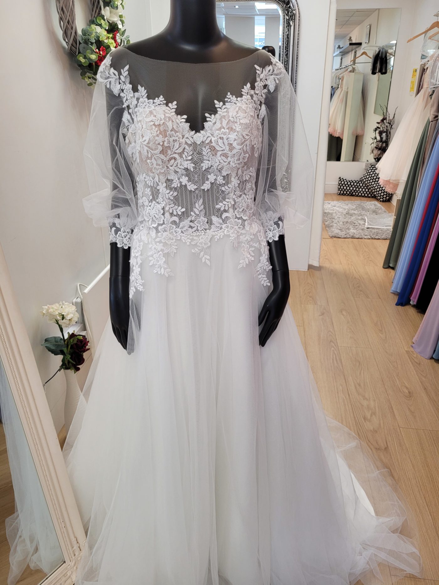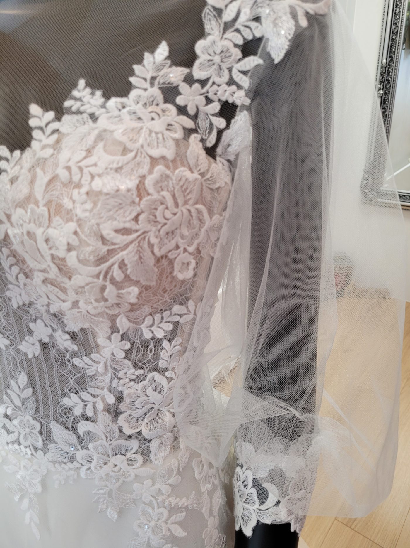 Style 23133 from the Tres Chic is the most beautiful lace applique sleeved gown. This lightweight gown has a floor length train and a billow sleeve on a soft tulle skirt.