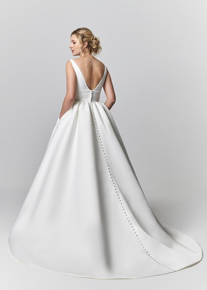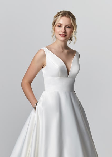 Style PB0020 is a satin V-neck gown with high waistband on satin ballgown